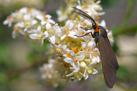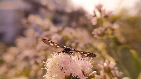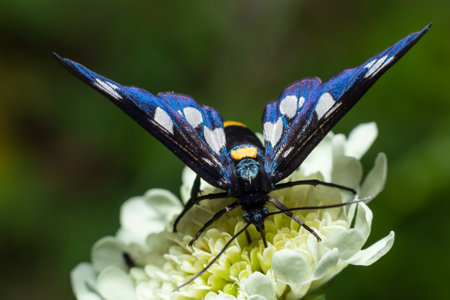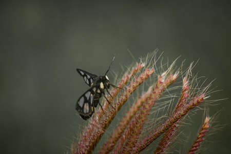 A moth is perched on a wildflower. This insect has the scientific name Euchromia sp.