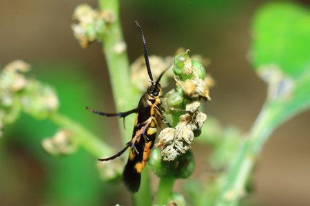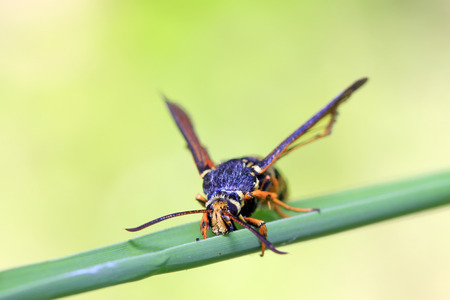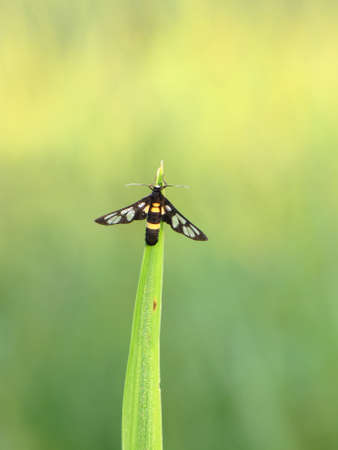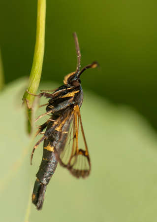 Close-up shot of the adult male of the six-belted clearwing (Bembecia ichneumoniformis). The wings have a yellow spot separating two transparent areas. The abdominal brush is black with yellow lines