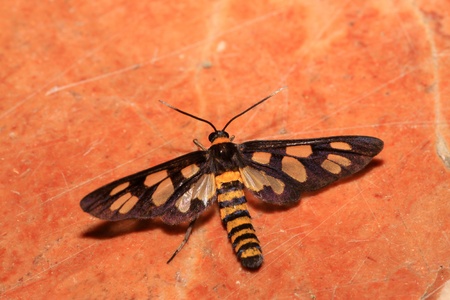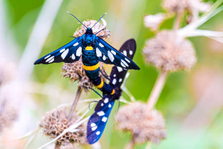 Close up of a nine spotted moth Amata phegea with spread wings.