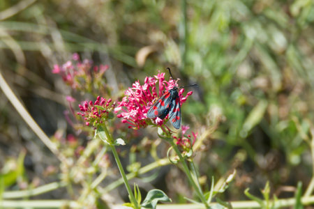 Closeup of a six-spot burnet butterfly Zygaena filipendulae, pollinating on purple Echium vulgare blueweed flowers during daytime.