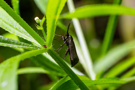 A black moth perched on a leaf, displaying its dark wings and subtle patterns, making it an excellent subject for studying insect behavior, camouflage, and the biodiversity of