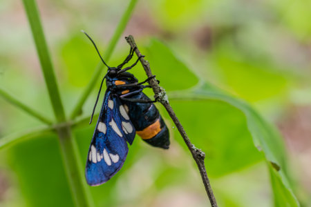 Amata phegea moth known for its striking blue and black colors with orange accents clings to branch while surrounded by vibrant green leaves forested area.