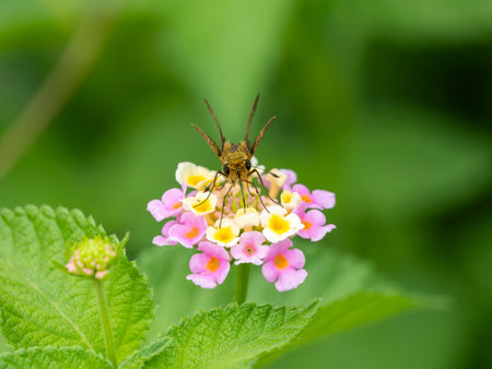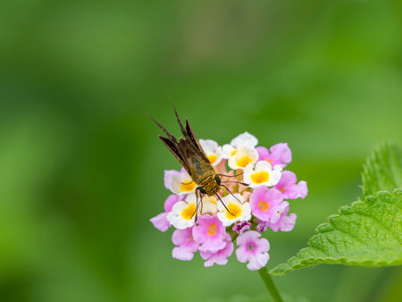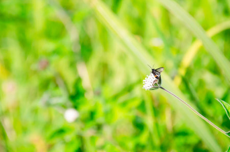 Beautiful Butterfly enjoy eating nectar from fresh flower isolated on green light bokeh background.