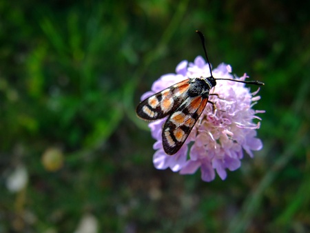 A Merry Burnet, Zygaena hilaris, on a flower.