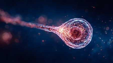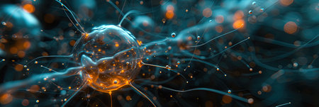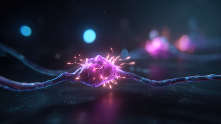 This stunning image captures a detailed neuron featuring glowing synapses amidst a dark abstract background, illustrating the complexity of neural connections and brain activity.