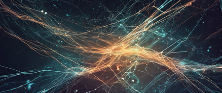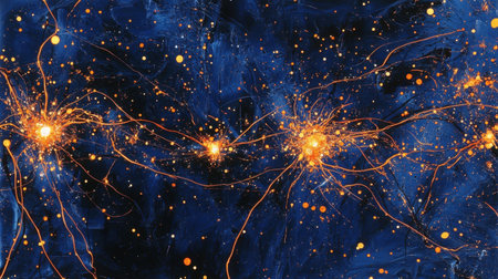 This vibrant abstract image showcases a network of glowing neurons and connections, symbolizing the complexity and beauty of technology and biology in motion.