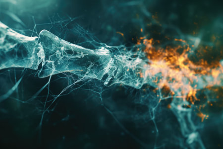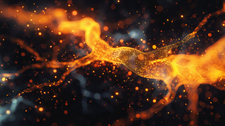 A close-up image portrays the intricate structure of neurons, highlighting the complex network of neural connections. The artwork features a dynamic interplay of light and shadow, emphasizing the delicate forms and textures. Suitable for scientific publications, educational resources, and conceptual illustrations on the human body.
