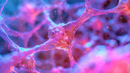 Stunning close-up view of vibrant neurons displaying intricate connections. The colorful glow illustrates the complexity of neural networks in an abstract representation.