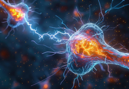 Microscopic view of active neurons firing and showing synaptic transmission in nervous system