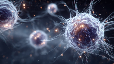 White blood cells drifting in a hazy medical visualization of the immune system. Generative AI