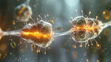 Microscopic view of nerve cells exchanging neurotransmitters, forming connections and transmitting signals crucial for brain function. Generative ai