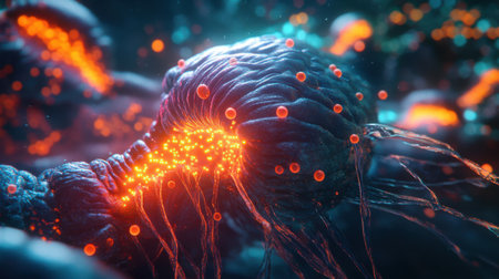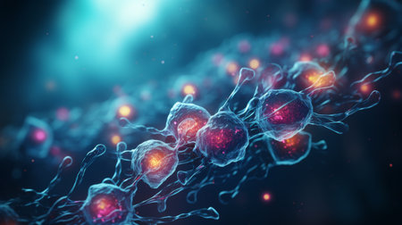 This image features a detailed illustration of interconnected biological cells, showcasing intricate molecular structures and vibrant color gradients. The composition uses a dark background to emphasize the highlighted shapes and forms. This image is suitable for scientific articles, educational materials, and various commercial applications that require visualizing biological concepts.