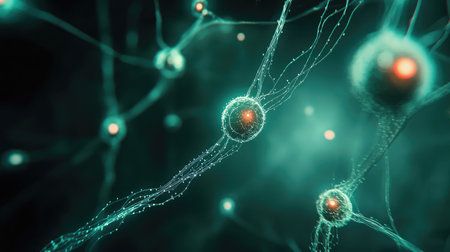 An abstract image presents a close-up view of nerve cells, with a focus on their intricate details. The composition uses vibrant colors, primarily green and red, contrasted against a blurred dark background. This visual approach creates a sense of depth and scientific precision, suitable for educational and illustrative purposes.