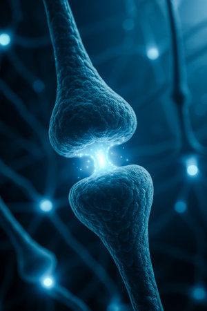A detailed close-up of a synapse showing the connection between neurons in blue hues