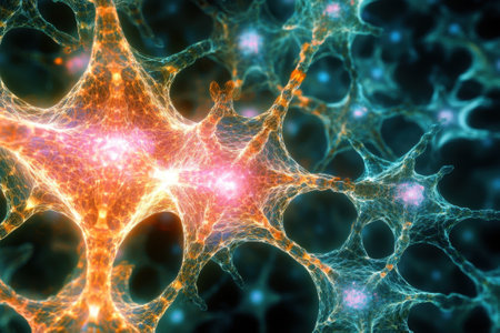 A detailed depiction of neuron activity showcases the complex web of connections within the nervous system. The bright synapses highlight the importance of communication between cells.