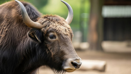 Close-up of a bison at sunset, golden hour glow. Wildlife and nature concept