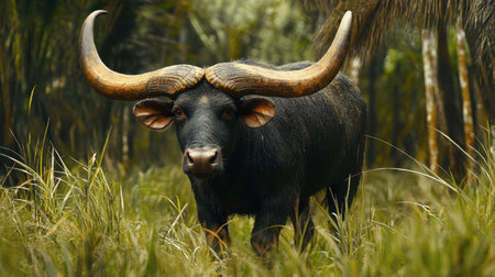 A close-up captures a water buffalo with impressive horns, its dark hide contrasting against a blurred background. The image displays a cool color palette with dramatic lighting, possibly captured in a jungle or forest environment. Suitable for editorial purposes or use in projects related to wildlife or nature.