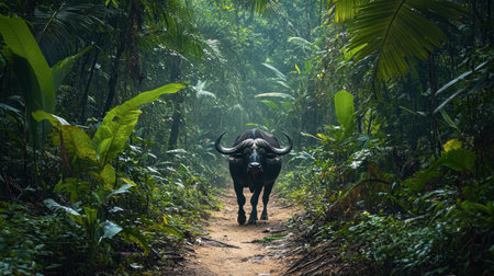 A majestic buffalo strides along a serene jungle path, surrounded by lush greenery and dense foliage, creating a peaceful atmosphere in nature.
