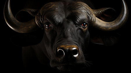 Majestic bull looking directly at the camera, isolated on a solid black background