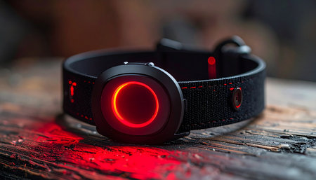 A piece of advanced wearable technology rests on a rustic wooden surface, its circular red LED light casting an ominous yet intriguing glow. This futuristic device hints at concepts of tracking, security, or cybernetic enhancement, blending cutting-edge innovation with a raw, natural environment.