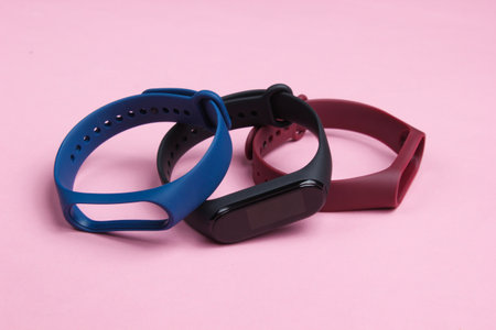 Smart watch with interchangeable bracelets on pink background. Fitness tracker. Modern gadgets