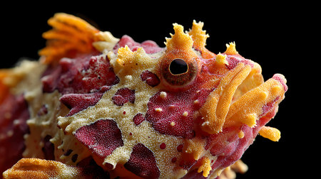 This close-up showcases a colorful fish, exhibiting a detailed pattern of red, blue, and orange hues. The image highlights the fish's textured skin, large eyes, and delicate fins against a dark background, possibly suggesting a studio setting. Ideal for illustrating marine life or aquatic themes for various commercial applications.