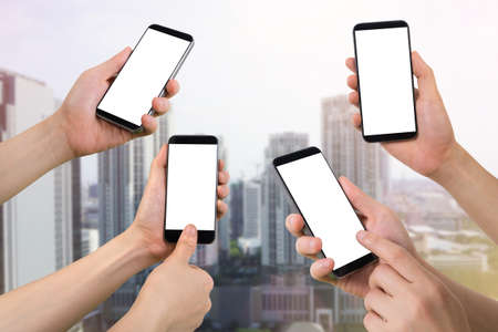 multiple human hand hold ,smartphone, tablet, cell phone on city building background.