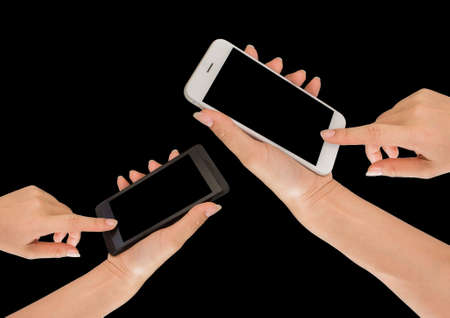 Smartphones of different generations with empty screens in the hands of a man and a woman close-up on a white background