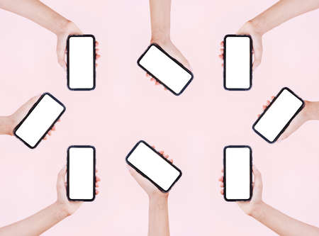 Female hands holding smartphones with mockup on background of pastel pink color.