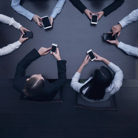 Get connected and stay in the know. Closeup shot of a group of unrecognizable businesspeople using their cellphones in synchronicity.