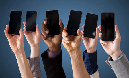 Group Of Hands Showing Mobile Phones Against Blue Background
