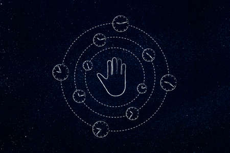 waiting or stopping time concept: hand making a stop gesture surrounded by spinning clock