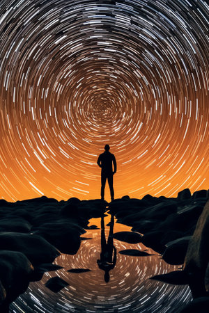 Generative AI : Circular Star trails facing north with Polaris the north star in centre and a silhouette human watching the stars move