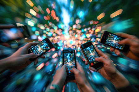 Audience at event uses smartphone camera to take photos and videos and live broadcasts