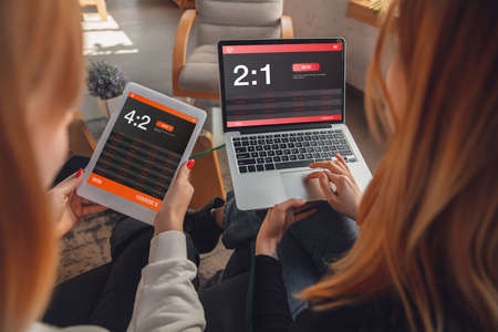 Close up laptop and smartphone screen with mobile app for betting and score. Female hands holding devices with match results on screens. Gambling, betting, sport, finance, modern technologies concept.
