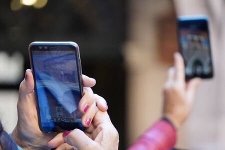 the hands of adults with phones, photos and videos of tourist attractions. travel, tour groups.
