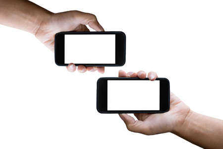 Two hands holding horizontal the black smartphone with blank screen, isolated on white background.