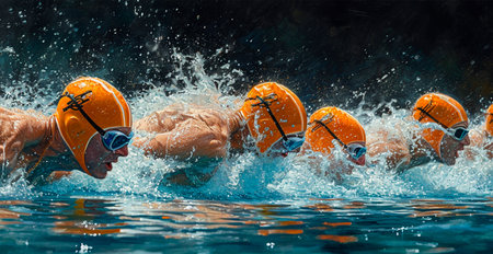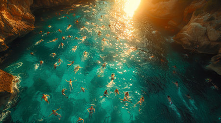 A gathering of individuals enjoying aquatic activity together in a body of water, Olympic swimmers diving into a pool, AI Generated