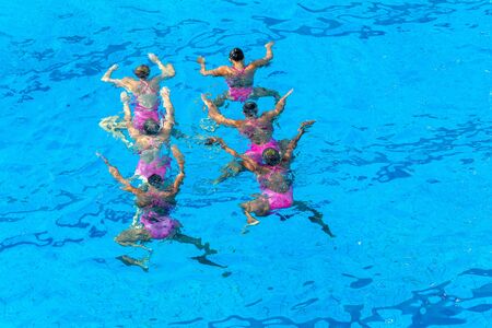 Synchronized swimming. Sports element. Woman athlete on the performance