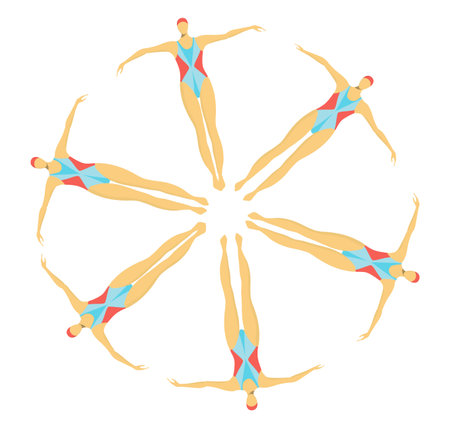 Six female synchronized swimmers in artistic formation. Athletic women performing water ballet. Synchronized swimming team performing routine vector illustration