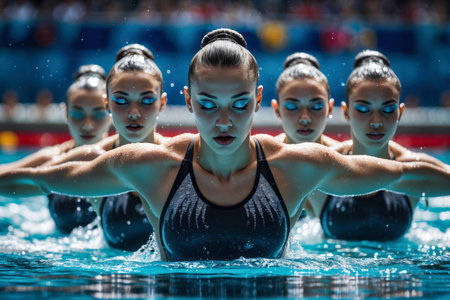 AI Generative Women Synchronized Swimming Team Dancing in Pool, Summer Olympic games Competition