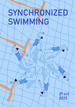 Synchronized swimming, female swimmers swimming underwater, promotion poster design. Women athletes performing water sports dancing in pool, artistic shapes, team competition. Flat vector illustration
