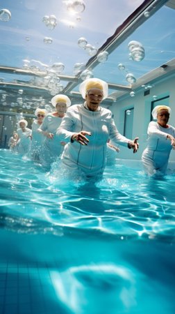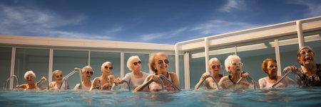 A group of older women are swimming in a pool together, AI