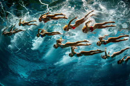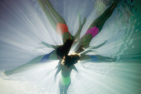 Synchronized swimming girls underwater dance action overhead pool photo.