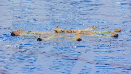 Group of swimmers swim in the sea at the races, open water sport
