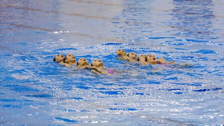 MOSCOW, RUSSIA - APRIL 1, 2016: Women's teams Championship in synchronized swimming at the indoor pool