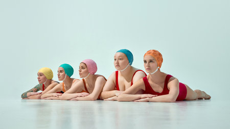 Five women in vintage swimsuits and swimming caps lying on floor in synchronized pose looking ahead against light blue background
