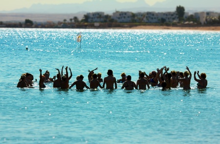 group of happy people do aerobics in sea