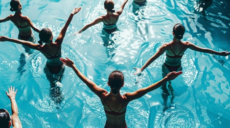 A group of women engages in synchronized swimming, showcasing their skills in a vibrant blue pool.