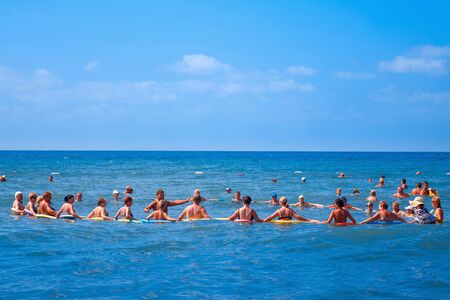Antalya, Turkey - September 26, 2017: group of people in the sea is engaged with an aqua aerobics trainer